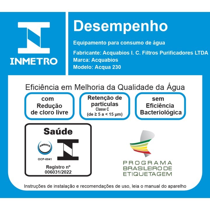 MÁXIMA EFICIÊNCIA PARA DECLORAÇÃO! Para ser utilizado em qualquer ponto que necessite de água limpa, sem excesso de cloro e impurezas. Prepare alimentos e bebidas com muito "Mais saúde para você e sua família"! O filtro ACQUA 230 é um filtro para PONTO DE USO (POU), na cor branca ou transparente, acompanhado de refil em carbon block, fabricação exclusiva ACQUABIOS, em embalagem caixa. Este filtro se caracteriza pela sua eficiência na remoção de partículas superiores a 5 micras, MÁXIMA EFICIÊNCIA na redução de cloro, odores e turbidez da água. Para garantir a qualidade dos refis para decloração, contamos com uma moderna planta de fabricação de refis com carvão ativado compactado - carbon block. Seu refil em carbon block possui acabamento de encaixe com vedações. Modernas e versáteis, as carcaças da ACQUABIOS se adaptam a diferentes reposições. Nossas tampas se adaptam a refis de encaixe ou rosca de ½’. Eficiente, este equipamento é certificado pelo INMETRO, e possui um ano de garantia contra defeitos de fabricação. Este equipamento é recomendado para instalação na pia diretamente no ponto de água, em torneiras de bancada sob a pia. Sua capacidade superior de vazão permite que você tenha água sempre filtrada também em pias de banheiros, chuveiros e em bebedouros.